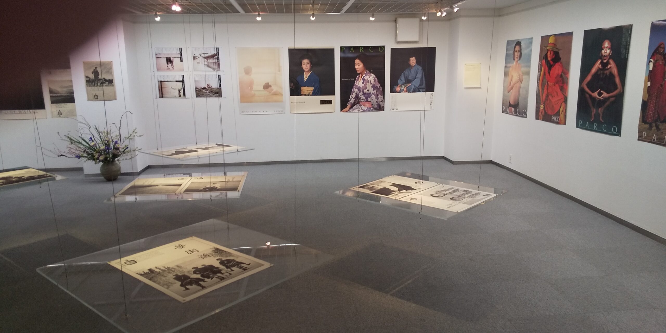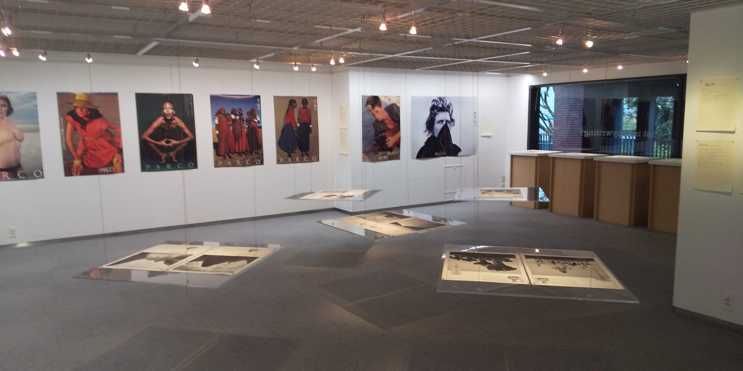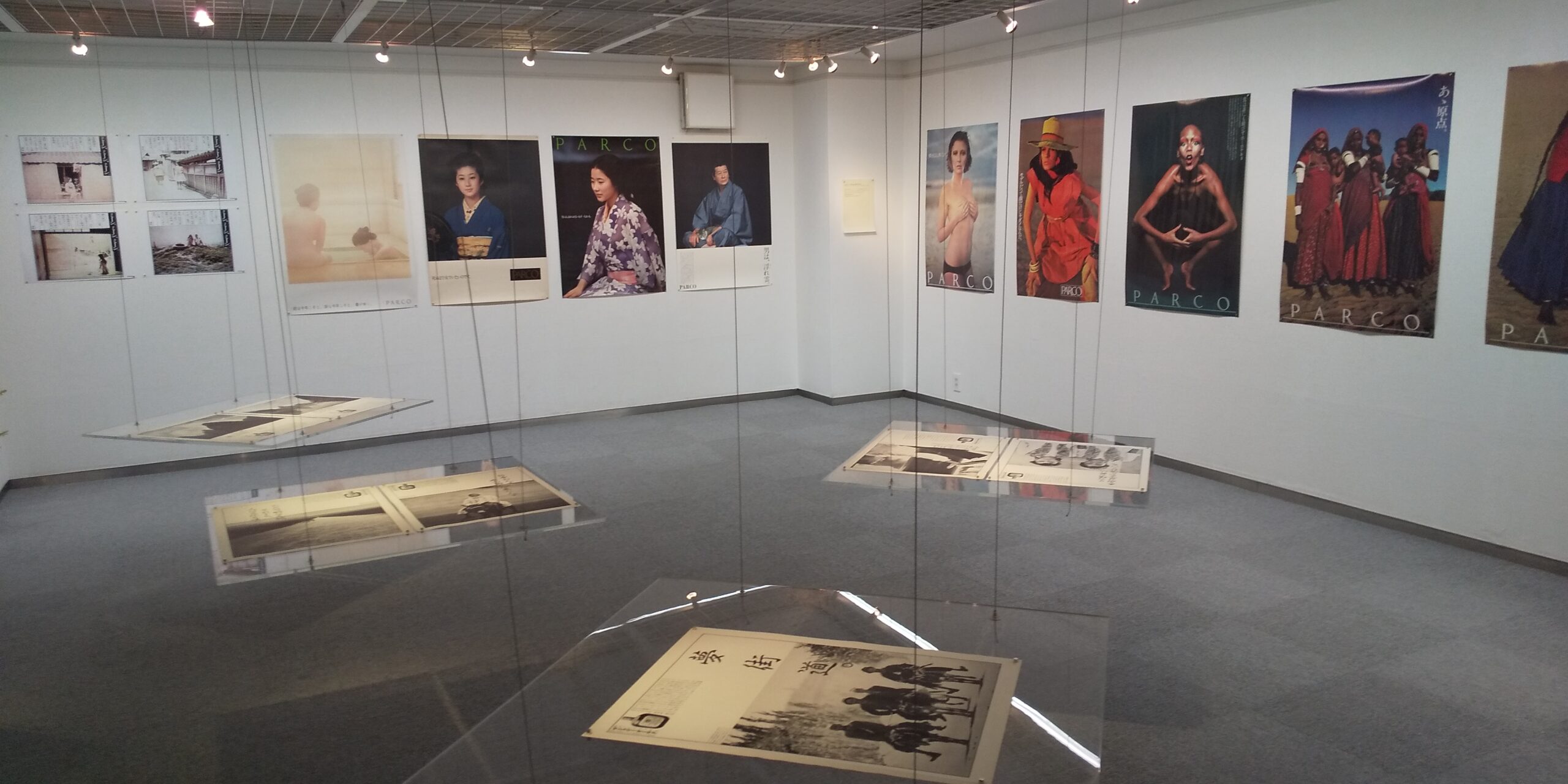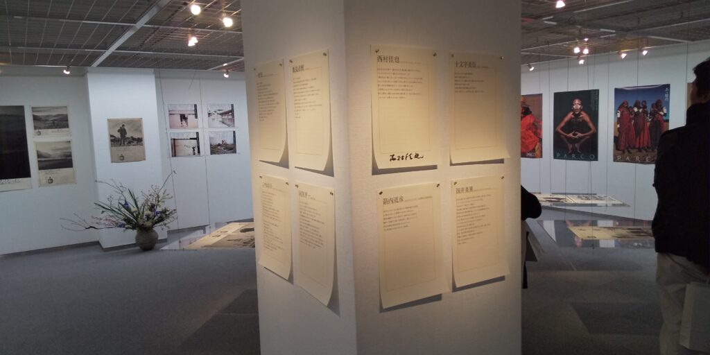 会場に一歩入ってまず全体を見渡す。長沢さんが最初にコンビを組んだアートディレクター長谷川好男さんとの仕事(1970年代 画面左半分)、および石岡瑛子さんと組んだ仕事(右半分のPARCOのポスター)