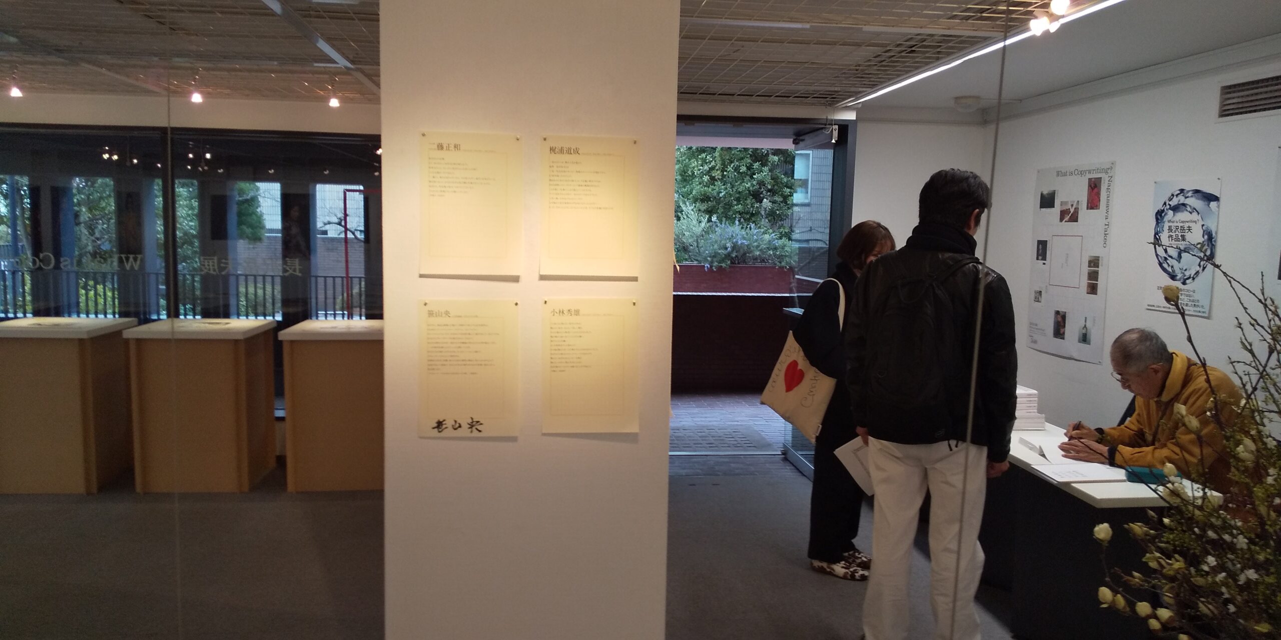 手前の柱には、長沢さんの仕事に敬意を表するクリエーターの人たちのオマージュやコメントの文章が貼り出されています。